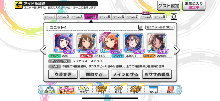 編成については、フェスで高森藍子ちゃんを引けたので、わりと充実していた方ではないかと思います。シンフォニーはその藍子ちゃんだけしか手持ちがいませんでしたので、ゲストで呼べる枠3人はいずれもシンフォニーで使いました。