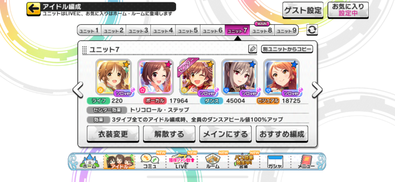 もう少し役に立てるかもしれないお話としては、放置編成を組むにあたり7中のダメガが無くても11高や7高でいける曲もあるという点です。チャームをセンターにする前提なので、特技にポテを振っていますが、スキルブースト(トリコロールアビリティ)をセンターにすればそれは必要ありません。