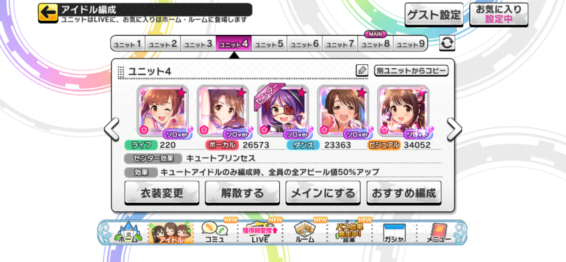 キュートのイベントで使ってた編成ですが、センターはユニゾン卯月ではなくて、プリンセス美玲に変わります。